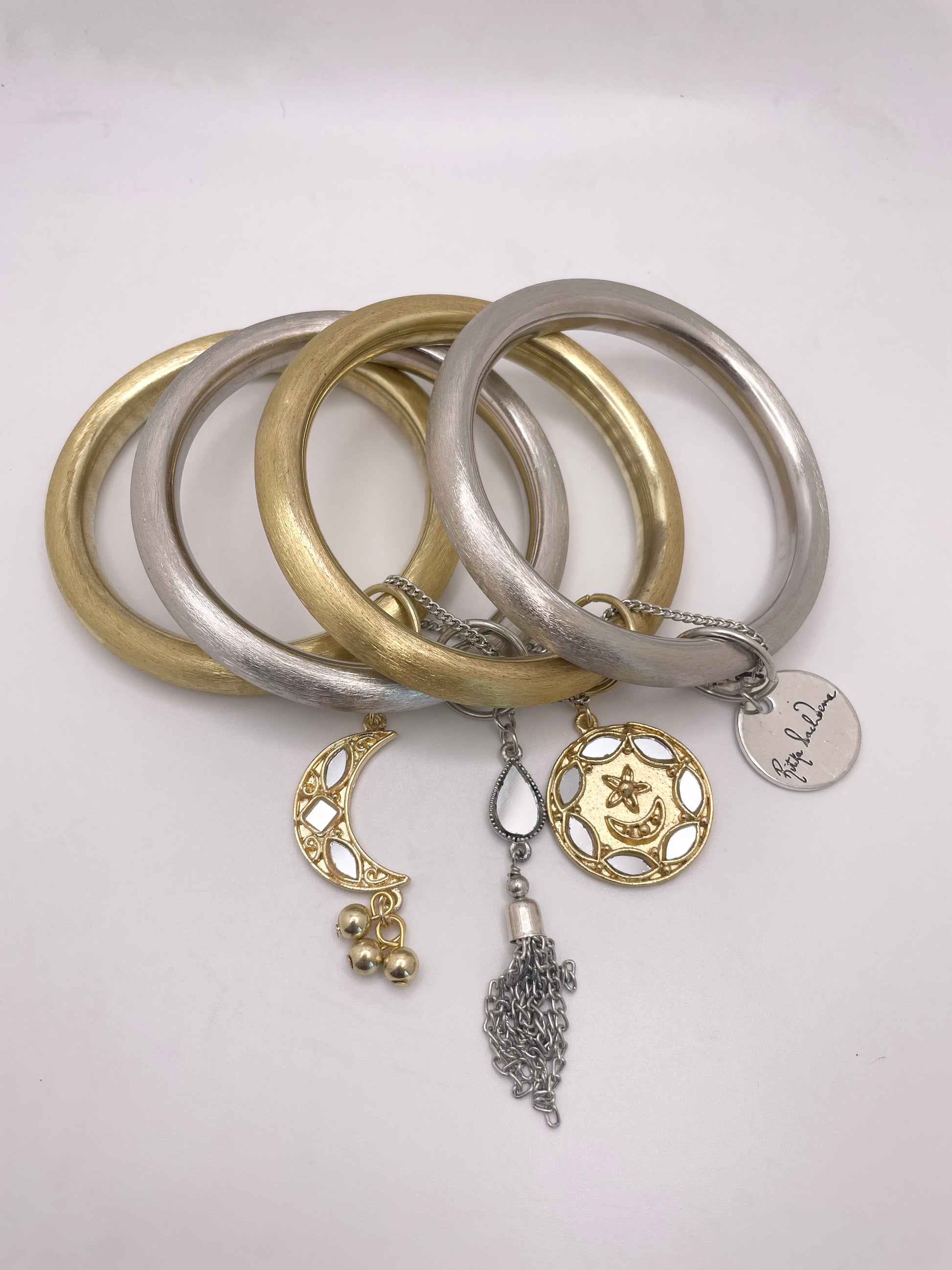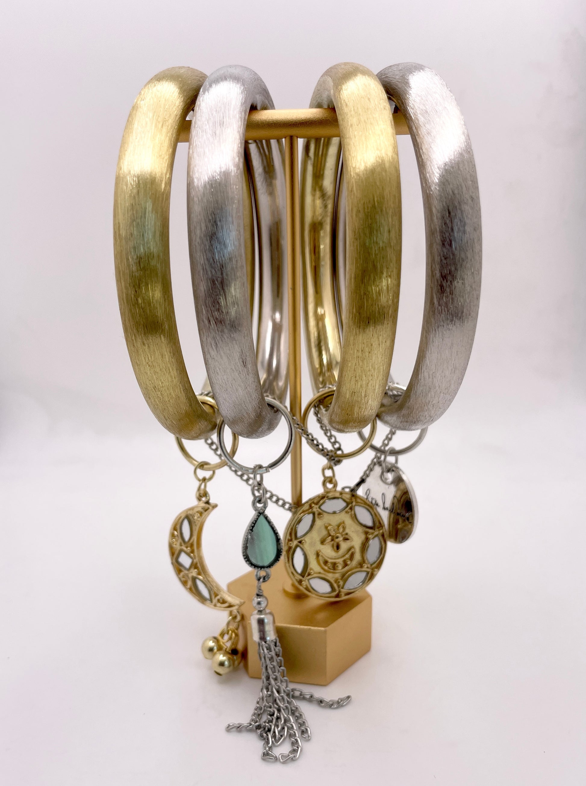 Gold & Silver Mixed metal bangle stack with hanging motifs