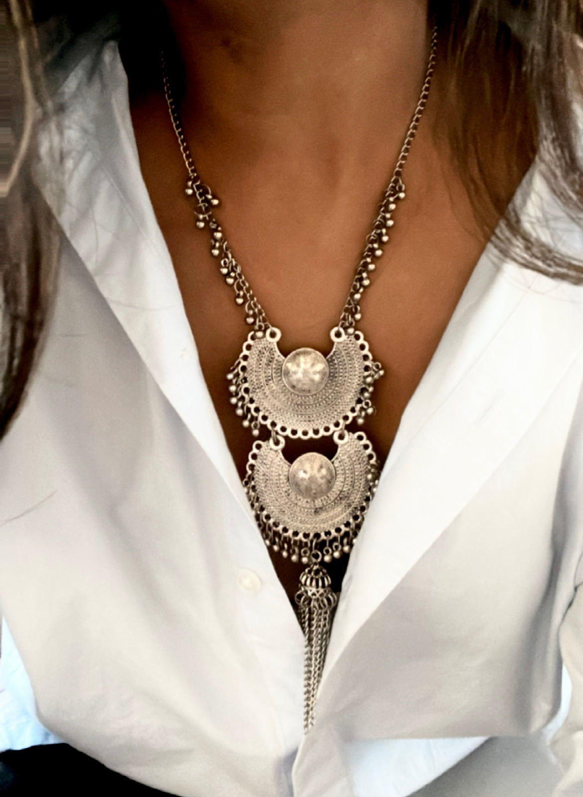 This boho-inspired metal oxidized necklace will complete your Indian Fusion look or wear it with your favorite button down shirt and jeans for an epic indo-western ensemble.