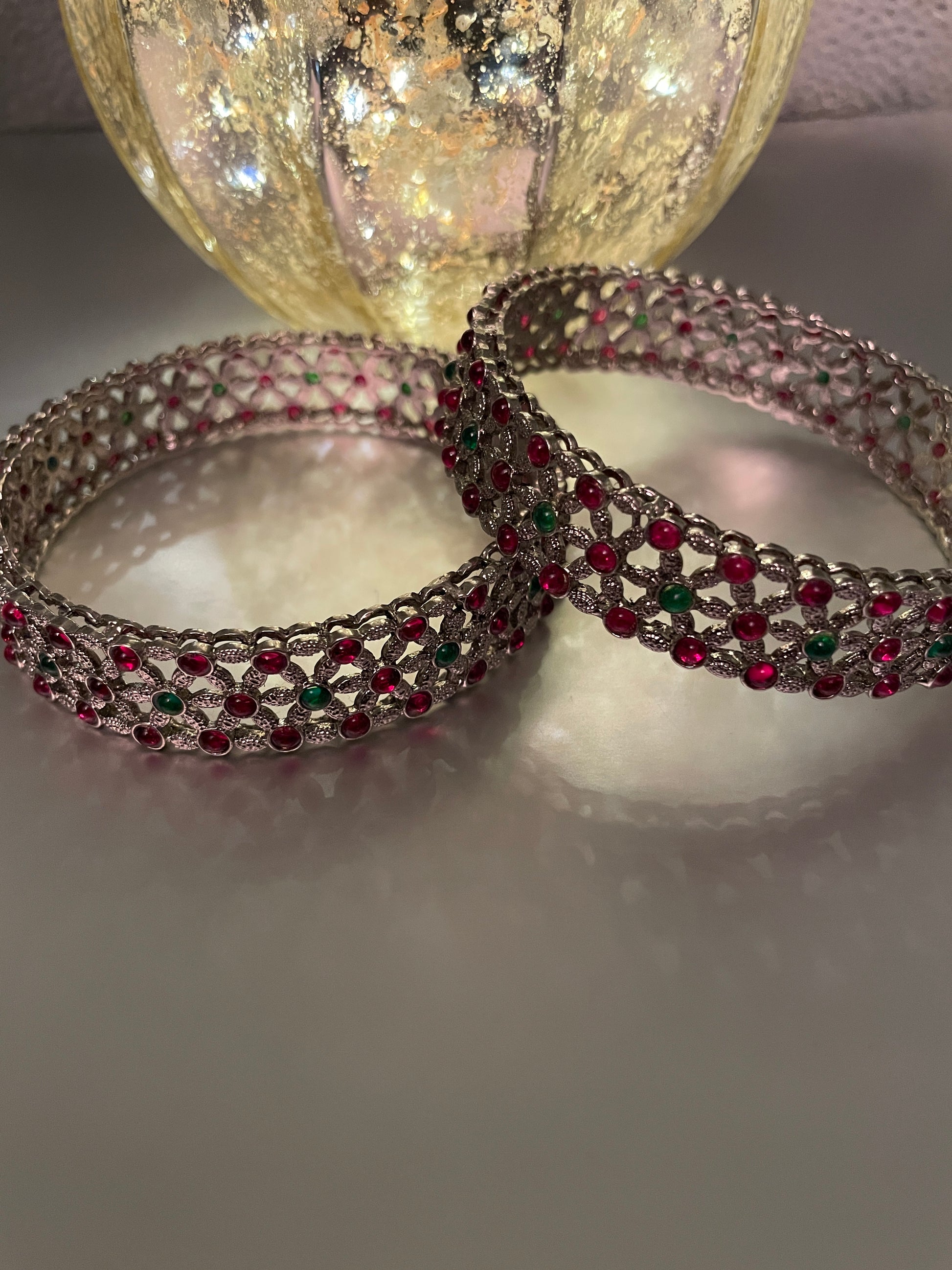 Antique silver bangles adorned with red and green crystals. Wear them alone or with other bangles to create the perfect stack.